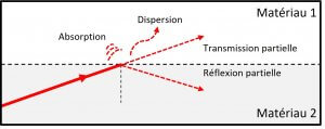 Une petite quantité de lumière peut aussi être absorbée par le matériau, et une portion peut être dispersée plutôt aléatoirement. Le comportement de la lumière est défini par l’index de réfraction et les propriétés chimiques des deux matériaux.
